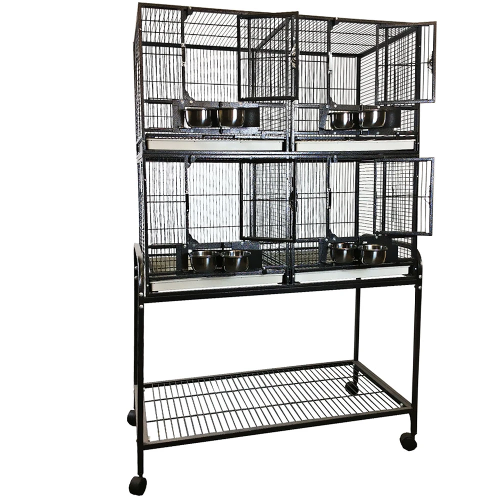 A&E Cage Company 4 Unit Cage with Stand and Removable Dividers this is the cage that every breeder and pet store owner needs for housing or displaying their birds. A space saving design that fits four separate enclosures in one convenient spot. The welded bar design is made of the highest quality wrought iron blasted with a non-toxic and chip resistant powder coating. 1/2″ bar spacing and 5mm thickness.