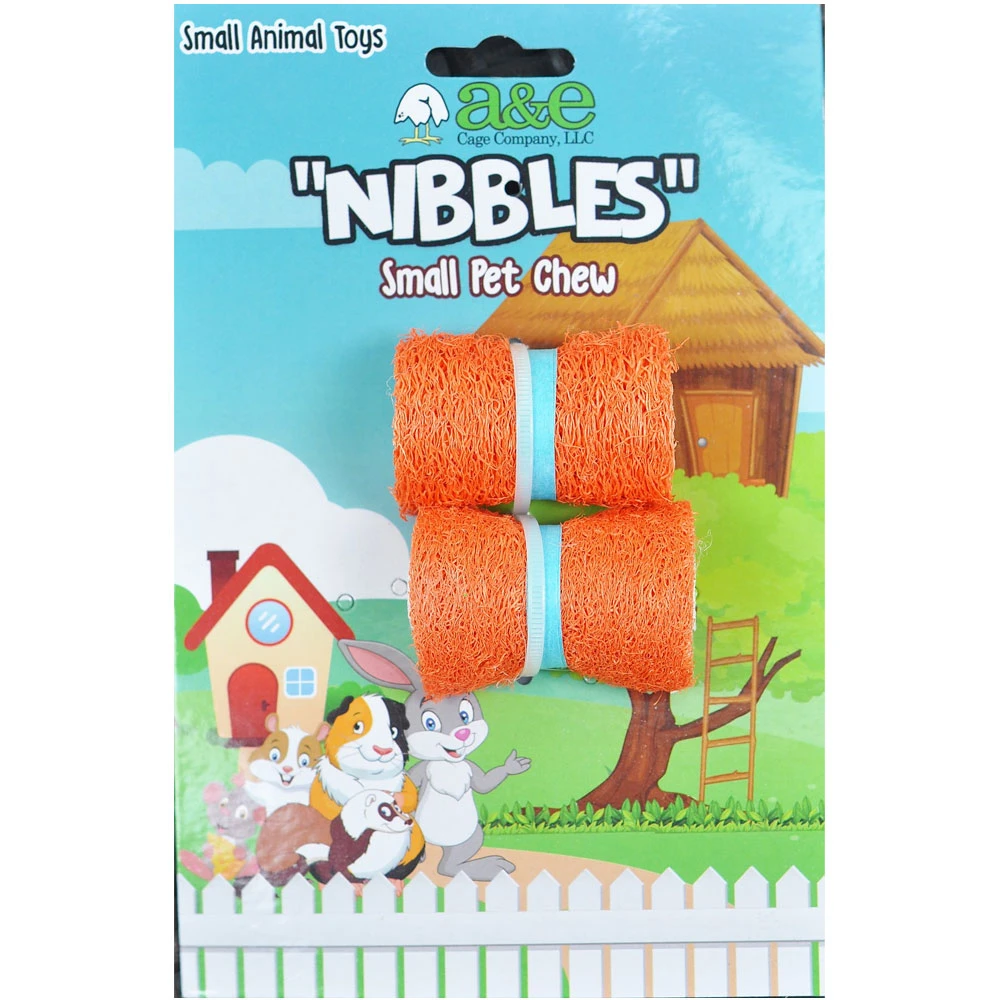 A&E Cage Company Nibbles Loofah Sushi Roll Small Pet Toy. The colorful chew toy is paw-fect for nibbling and playing with. A&E Cage Company offers Loofah toys for small pets in a variety of shapes, sizes and colors (sold separately). Not only will they satisfy your little sidekick’s urge to chew, but they will also help promote healthy teeth and gums and reduce boredom!