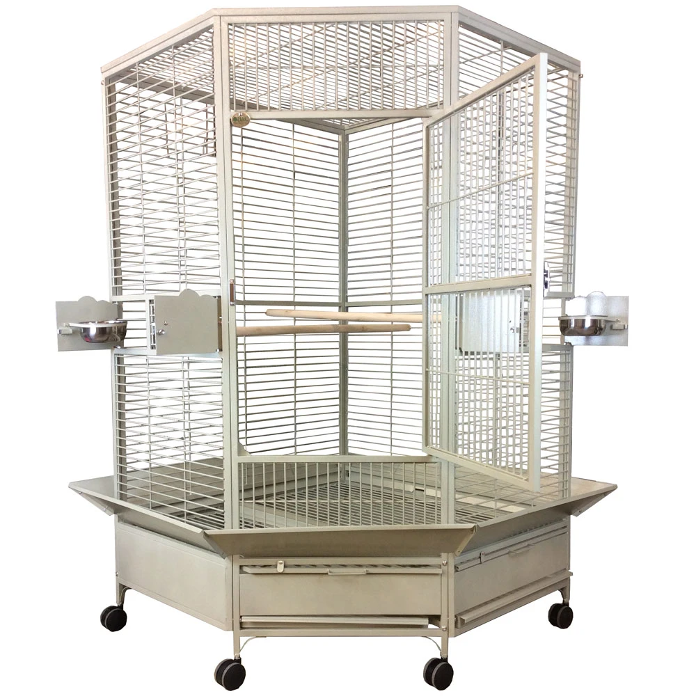 A&E Cage Company Corner Bird Cage this cage conveniently fits in a corner and offers a roomy interior and a topside play area. It comes with a bird proof front door, feeder locks, multiple ladders and perches, and two lock-in cups for the playpen top. A slide-out metal tray, three swing-out feeder doors, and three stainless steel feeder cups make feeding easier. Other features include two interior perches, a slide-out grill and tray for easy cleaning and a durable non-toxic powder coat finish.