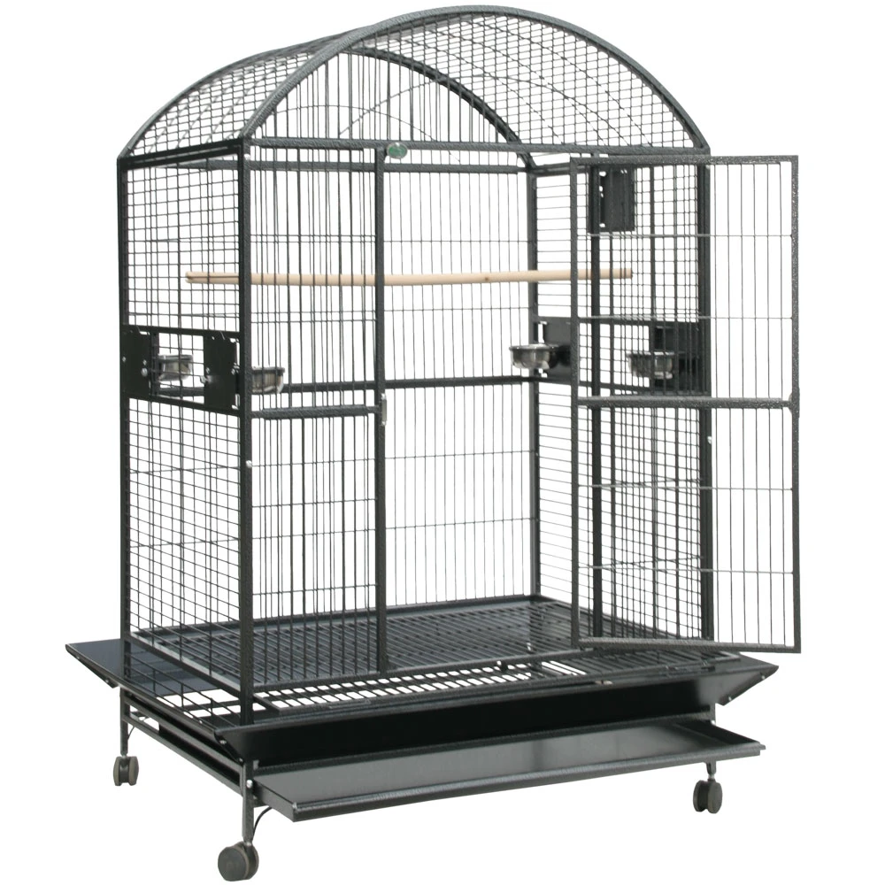 A&E Cage Company Dome Top Cage with 1″ Bar Spacing is ideal for larger birds. Dometop give added rooftop room. Made of wrought iron in your choice of finish color in several color options. 1 inch bar spacing, with super tough 5 mm thick bars. Includes 3 wooden perches and stainless steel feeing bowls. Removable seed tray and grate for easy cleaning. Has a breeder door for breed control. Mounted on caster wheels for easy mobility.