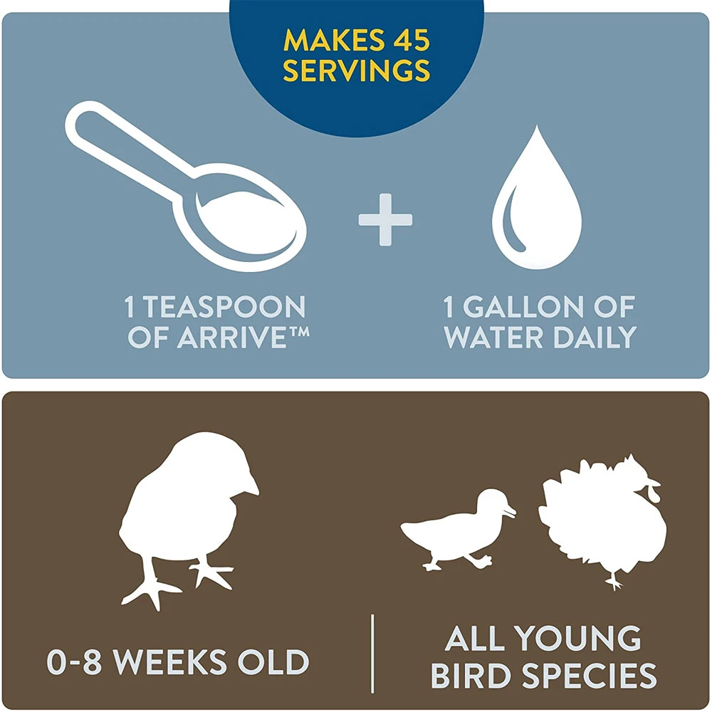 - Safe on all poultry species: Add 1tsp. of ARRIVE per gallon of water every day until chicks are 6 to 8 weeks old, then switch to FlockLeader THRIVE.