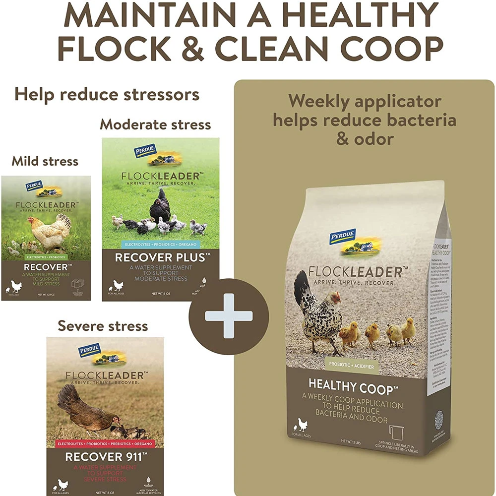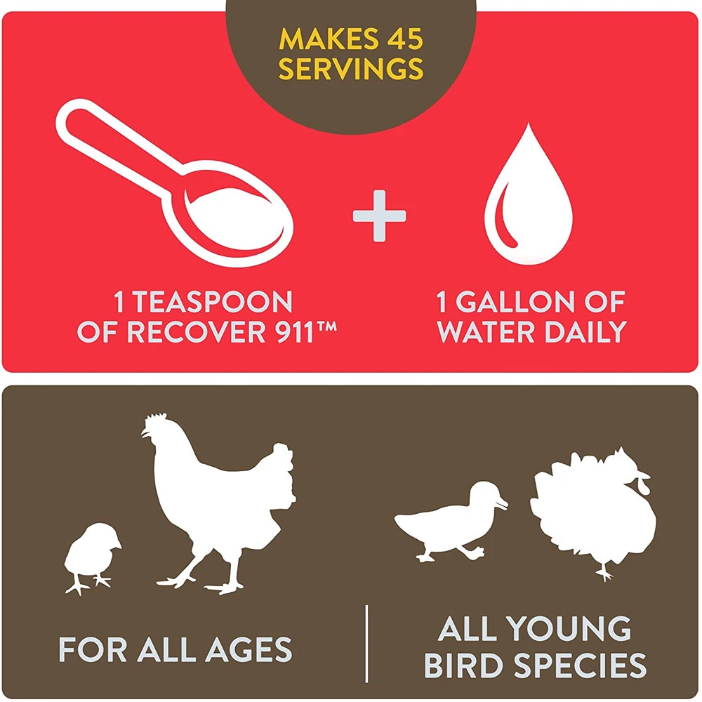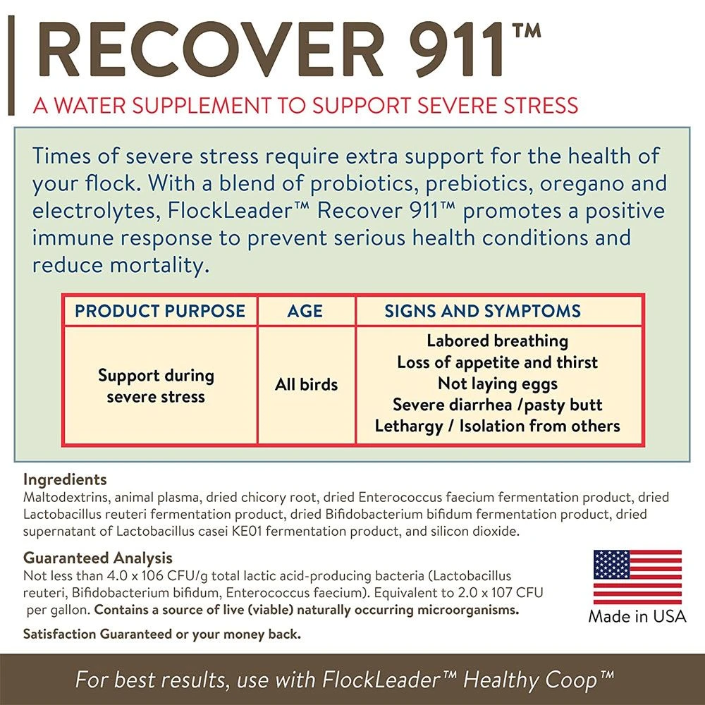 Flockleader Recover 911 a probiotic, prebiotic, oregano, and electrolyte supplement for severely stressed birds. FlockLeader Recover 911 treats severely stressed birds by encouraging a strong immune response for quick recovery and reduced mortality. FlockLeader Recover 911 promotes immunity and reduces the risk of mortality during times of severe stress. Providing probiotics, prebiotics, oregano, and electrolytes during those stressful periods can support the health of your chickens by helping to reduce bad bacteria and prevent dehydration. Add one teaspoon per gallon of water. During times of stress or hot weather, manufacturer recommends applying FlockLeader Recover 911 for 7 consecutive days. Discard any unused solution after 24 hours. This product can be used on all poultry species.