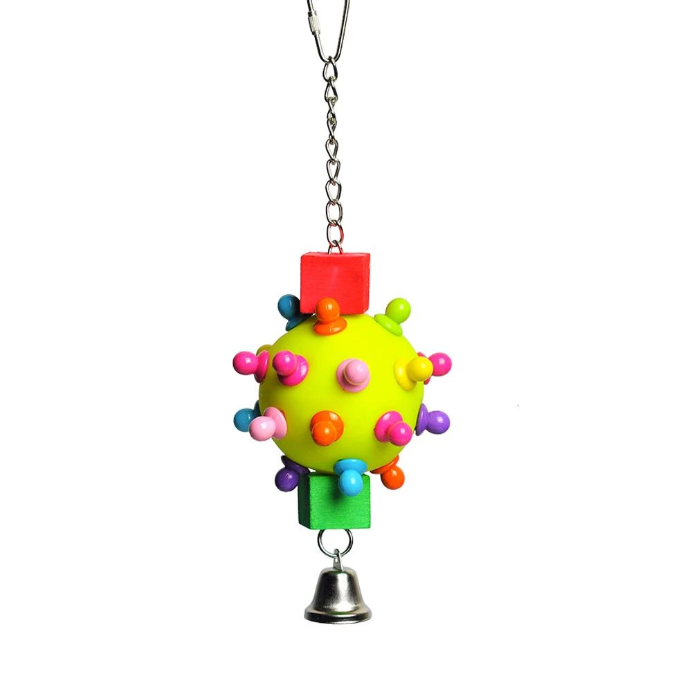 Happy Beaks Bird Toys Deep Sea Mine Jr. is the perfect toy for birds that love to play and have fun. It will keep your pet entertained as well as giving it the exercise it needs. This will keep your bird alert, happy, and healthy.Toys offer birds to play which help foster better mental health and independence. It is made with a colored wiffle ball and a small cork in each hole for your bird to chew and/or pull on. It is hung on a chain with a wooden spool at the top, as well as, a bell at the bottom for added fun.