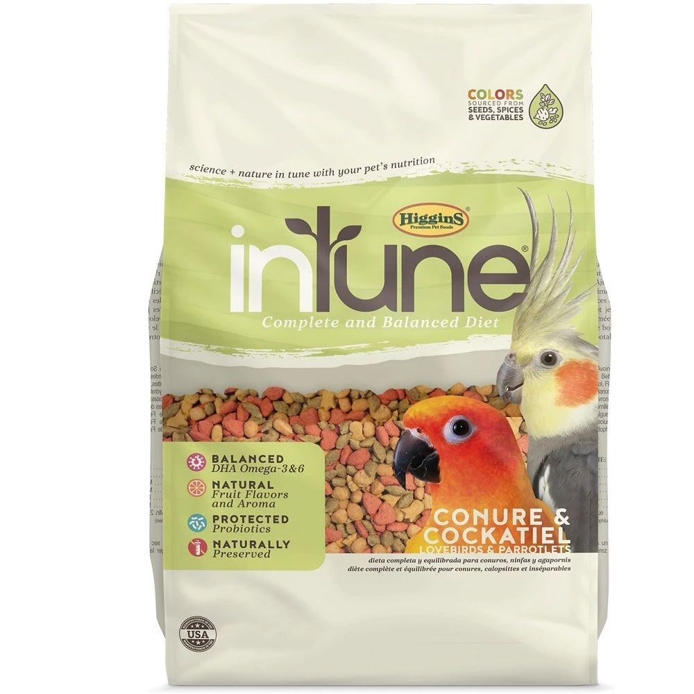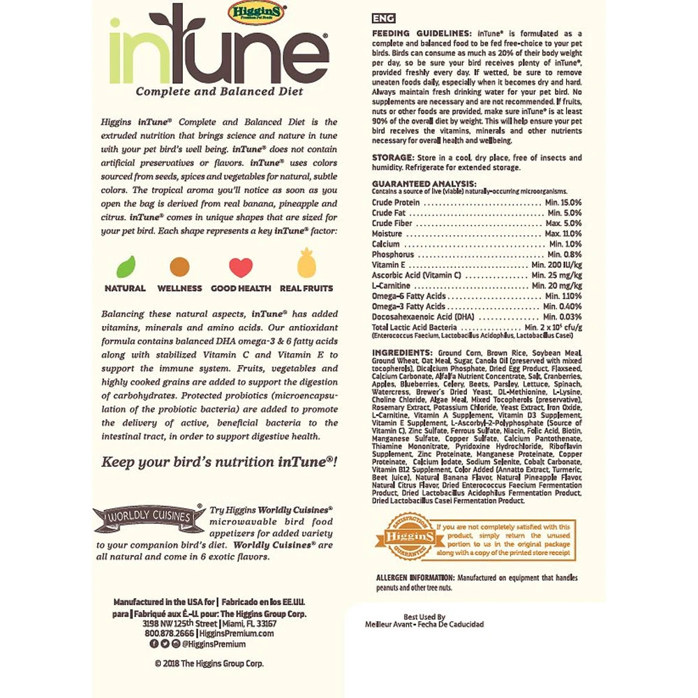 Higgins InTune is the extruded nutrition that brings science and nature in tune with your pet bird’s well being. inTune does not contain artificial preservatives or flavors. inTune uses colors sourced from seeds, spices and vegetables for natural, subtle colors. The tropical aroma you’ll notice as soon as you open the bag is derived from real banana, pineapple and citrus. inTune comes in unique shapes that are sized for your pet bird. Each shape represents a key inTune factor: