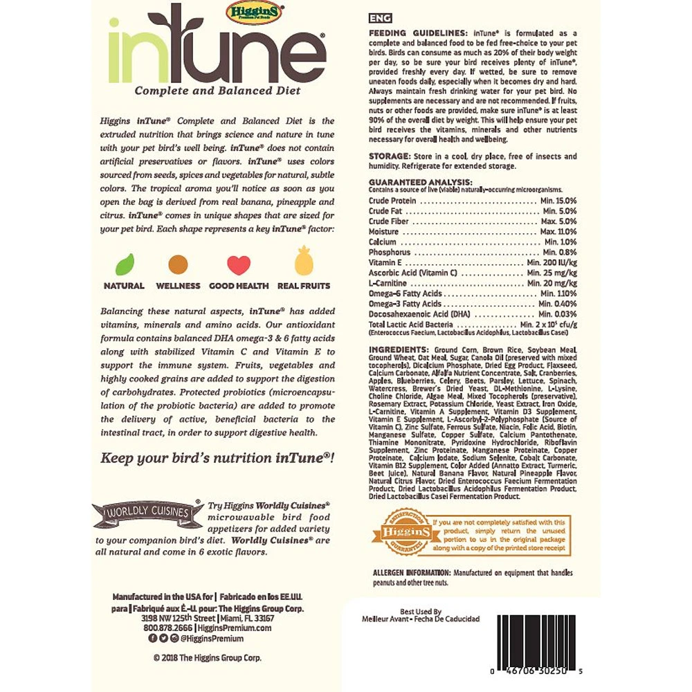 Higgins InTune is the extruded nutrition that brings science and nature in tune with your pet bird’s well being. inTune does not contain artificial preservatives or flavors. inTune uses colors sourced from seeds, spices and vegetables for natural, subtle colors. The tropical aroma you’ll notice as soon as you open the bag is derived from real banana, pineapple and citrus. inTune comes in unique shapes that are sized for your pet bird. Each shape represents a key inTune factor: