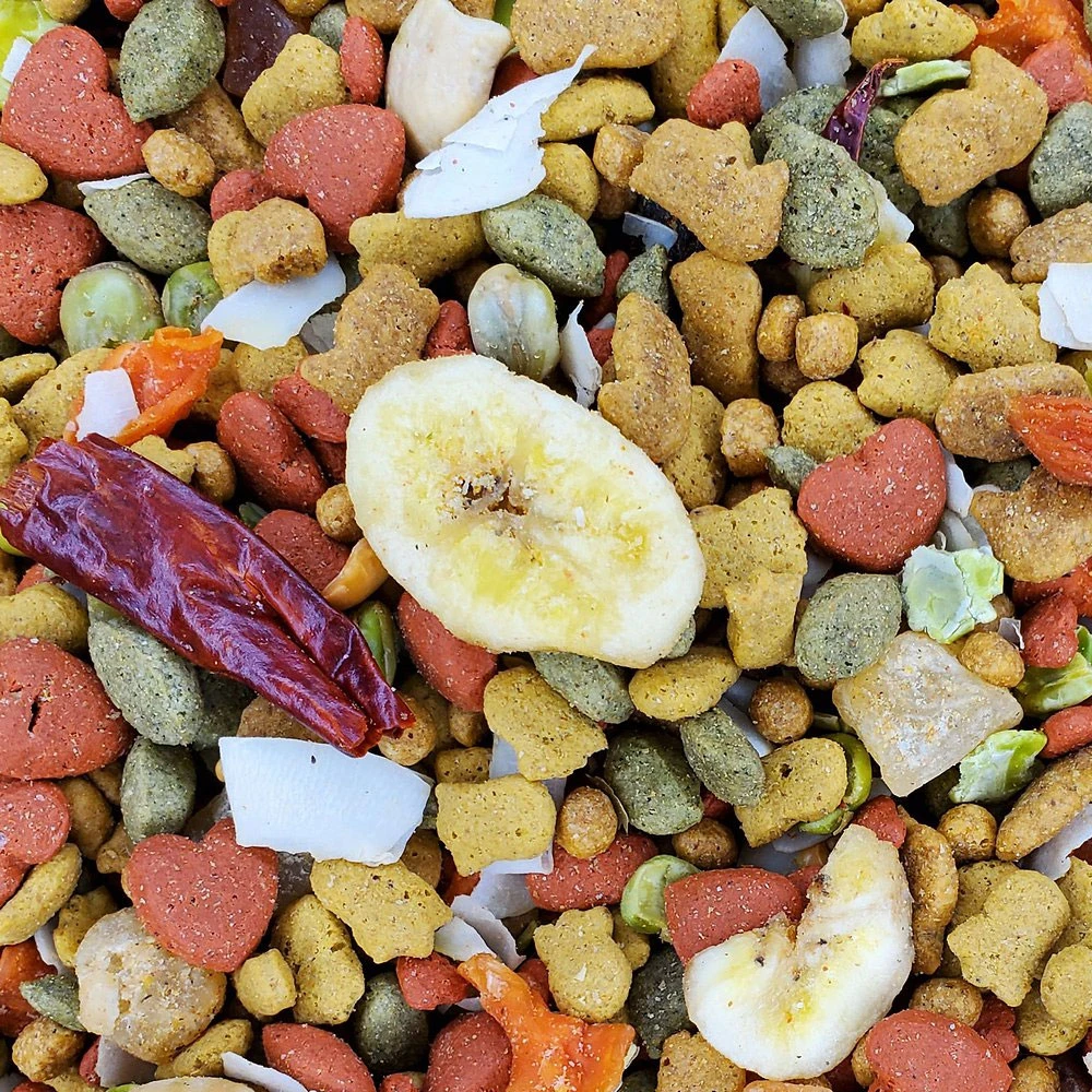 - A healthy, all-natural blend of fruits, vegetables and extruded pellets.