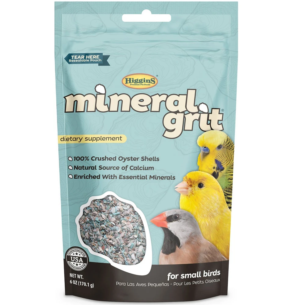 Higgins Mineral Grit Small Bird Supplement. It’s made of 100% all-natural oyster shells with zero gravel so it’s a great source of calcium and essential minerals, from nature and not man-made. Plus, it’s enhanced with additional minerals that help support overall health, and infused with anise oil for a unique, licorice flavor and aroma. It’s great for cockatiels, canaries, finches, parakeets and other small birds. Plus, it’s made in the USA and comes in a resealable package that’s easy to use and store.