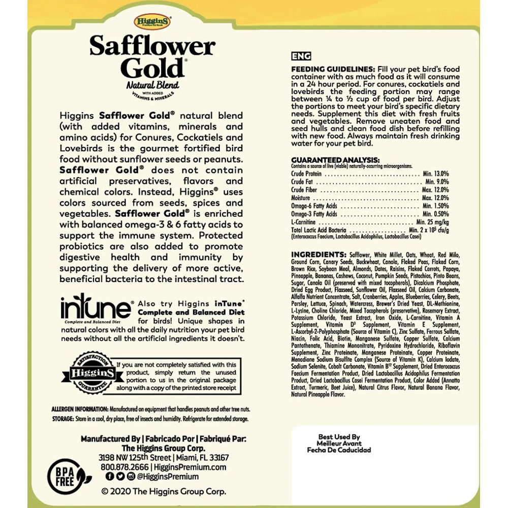 Higgins Safflower Gold is our natural blend (with added vitamins, minerals and amino acids) for Conures, Cockatiels and Lovebirds is the gourmet fortified bird food without sunflower seeds or peanuts. Safflower Gold® does not contain artificial preservatives, flavors and chemical colors. Instead, Higgins uses colors sourced from seeds, spices, and vegetables. Safflower Gold® is enriched with balanced omega-3 & 6 fatty acids to support the immune system. Protected probiotics are also added to promote digestive health and immunity by supporting the delivery of more active, beneficial bacteria to the intestinal tract.