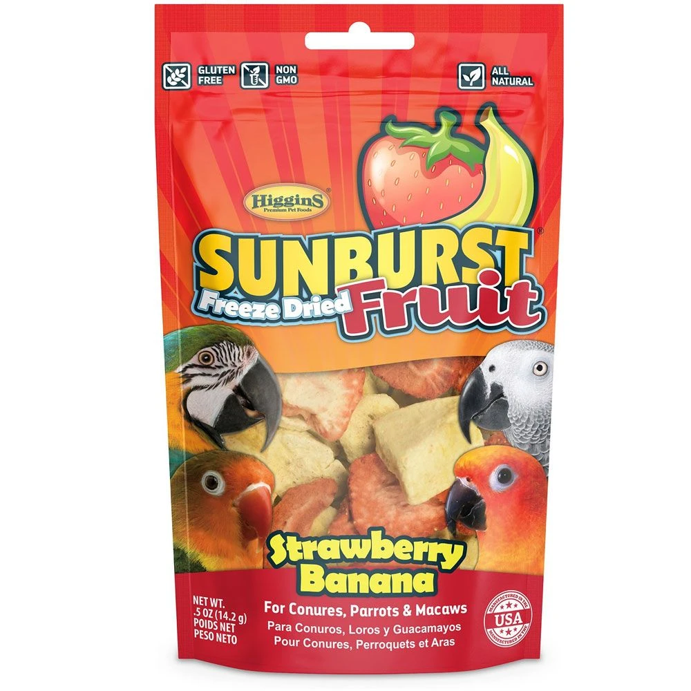 Higgins Sunburst Freeze Dried Fruit Strawberry Banana Bird Treats, It’s made with two simple ingredientsbananas and strawberries that have been harvested at their optimal ripeness and then gently freeze-dried to lock in flavors and nutrients. Sweet-tooth-satisfying for most fruit-loving birds, it’s great for macaws, conures, and parrots. Plus, there’s absolutely nothing that’s not from nature, which means zero GMOs, gluten, sulfites, added sugars, or artificial flavors, colors, or preservatives. And it even comes in a resealable package so it’s handy for treating and snacking.