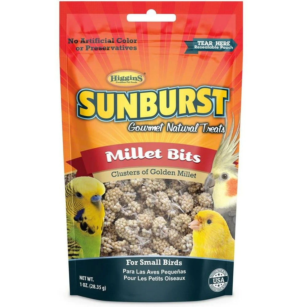 Higgins Sunburst Millet Bits Gourmet Treats are an assortment of fun, healthy, natural snack mixes that supplement your pet’s regular diet. Millet Bits for all small birds, including Canaries, Finches, Parakeets and Cockatiels, is a collection of NON-GMO golden millet clusters right off the sprays. Your pet bird will go wild over this natural treat!