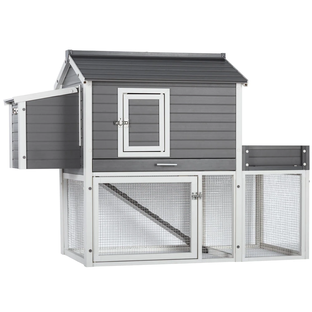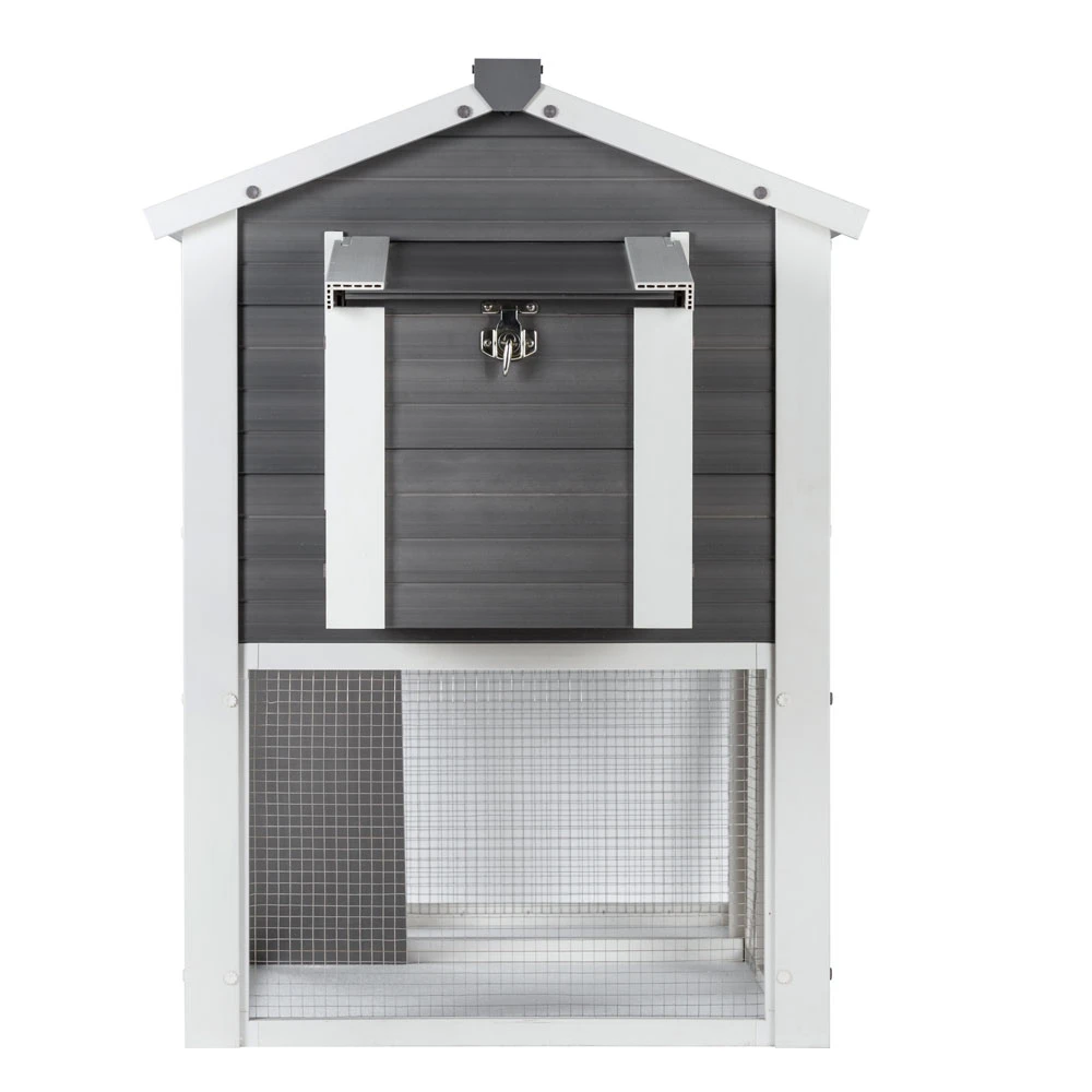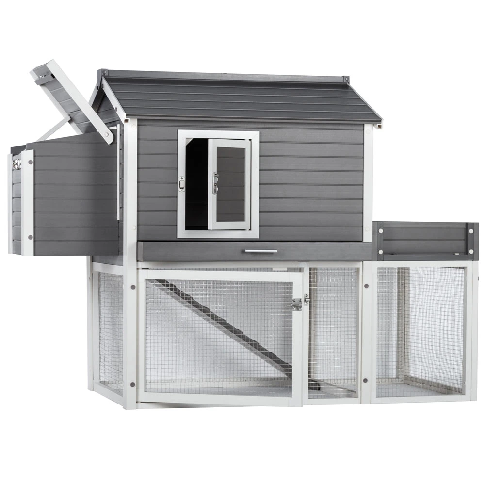 New Age Pet Garden Coop a proprietary composite blend of recycled polymers and reclaimed wood fiber by-products. The ECOFLEX material is non-toxic, eco-friendly and impervious to moisture and odor, making it the perfect material to keep your flock happy and healthy. All New Age Pet outdoor products are backed by an unrivaled 10-year limited manufacturer warranty. This coop features 2 levels of living space, a single-compartment nesting box with hinged lid for easy egg collecting, 2 roosting bars and an easy to clean, ECOFLEX pull out tray. 2, 1 on the coop, 1 on the pen. The top level has 1-door opening to the main coop and an opening to allows access to the ramp to the ground level pen, which is open to the ground, so your flock has access to a shaded and grassy area. The lower pen area has an entry door secured with predator resistant latch and is constructed using NeveRust stainless steel wire mesh for years of maintenance free use.