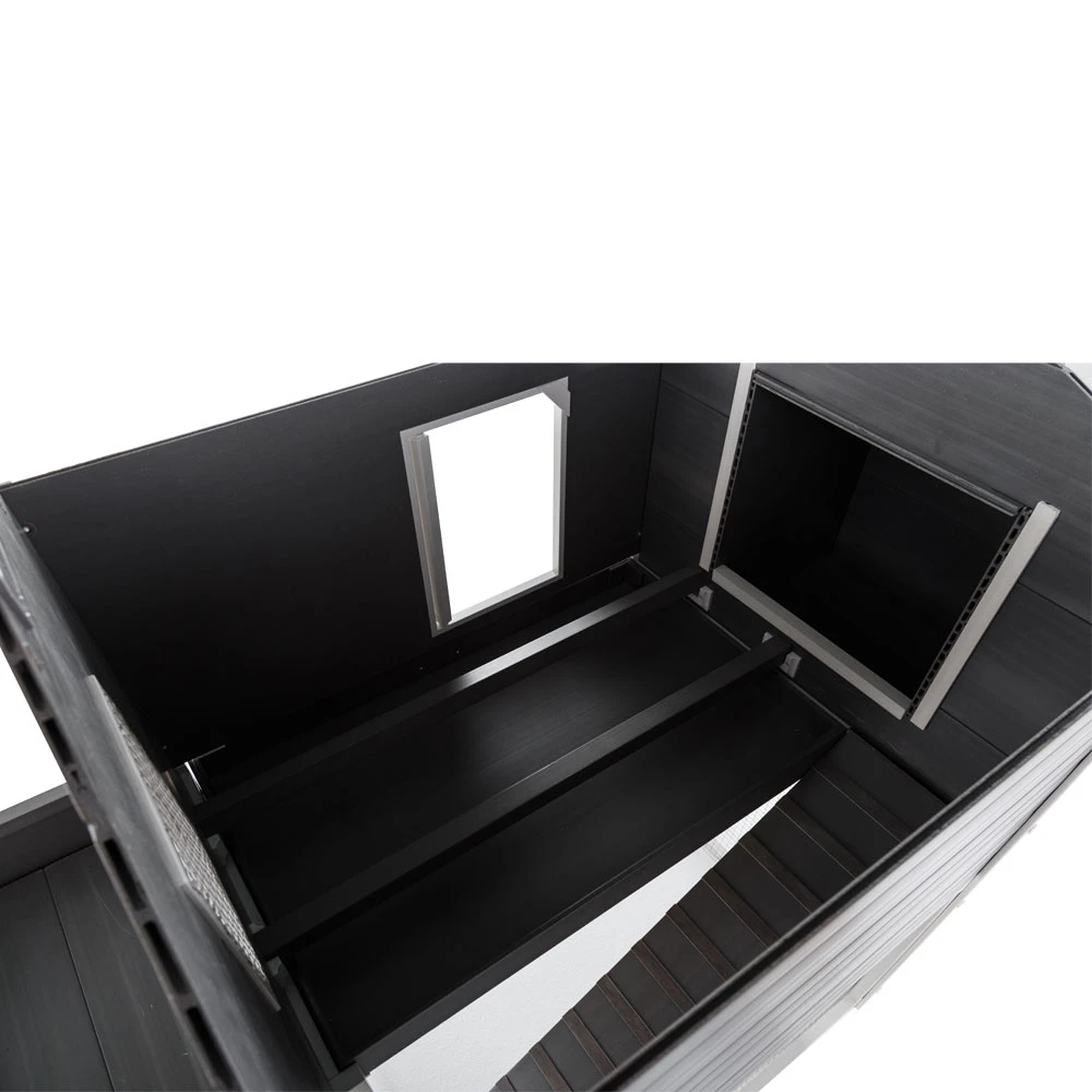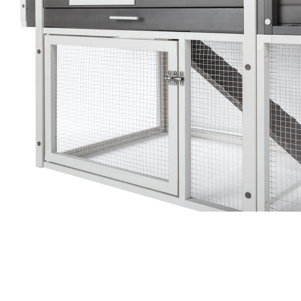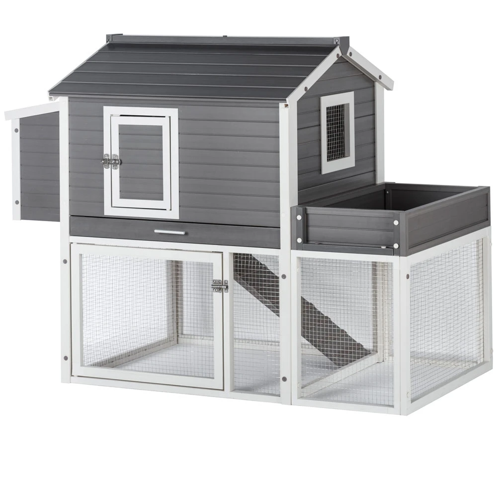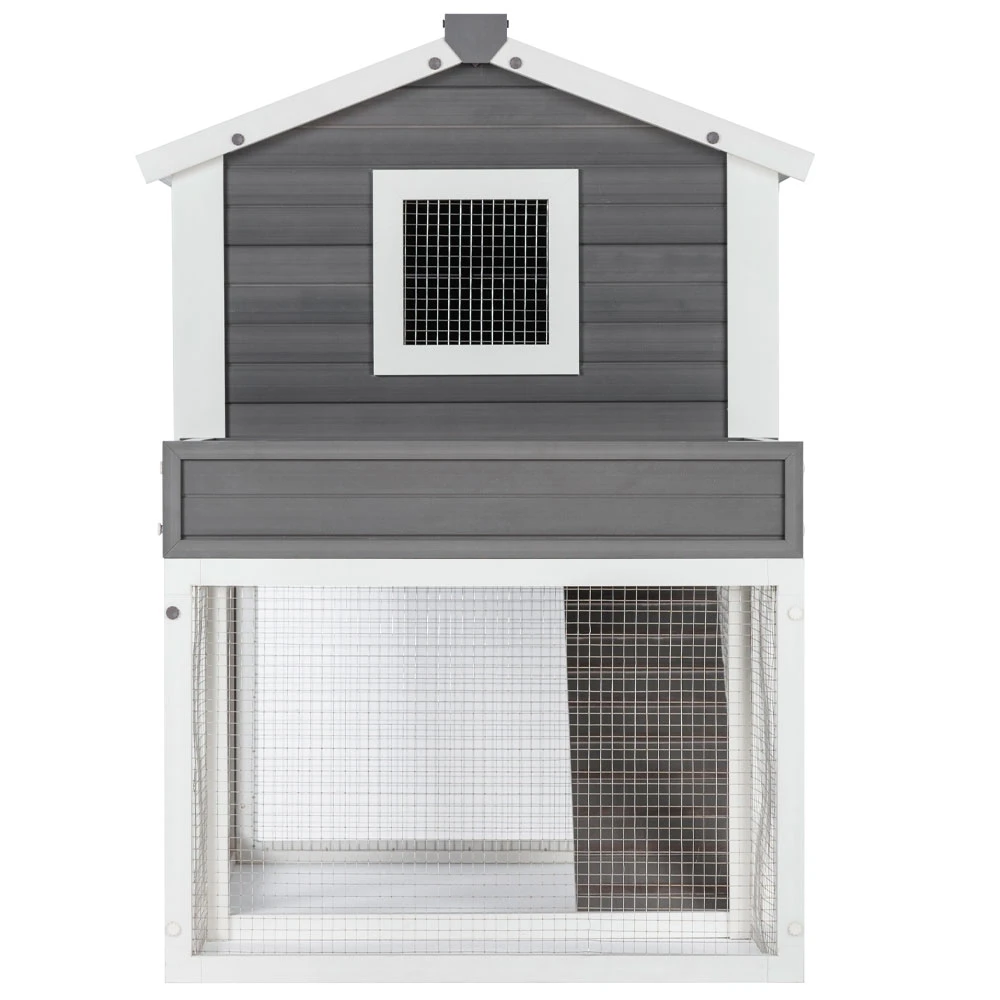 New Age Pet Garden Coop a proprietary composite blend of recycled polymers and reclaimed wood fiber by-products. The ECOFLEX material is non-toxic, eco-friendly and impervious to moisture and odor, making it the perfect material to keep your flock happy and healthy. All New Age Pet outdoor products are backed by an unrivaled 10-year limited manufacturer warranty. This coop features 2 levels of living space, a single-compartment nesting box with hinged lid for easy egg collecting, 2 roosting bars and an easy to clean, ECOFLEX pull out tray. 2, 1 on the coop, 1 on the pen. The top level has 1-door opening to the main coop and an opening to allows access to the ramp to the ground level pen, which is open to the ground, so your flock has access to a shaded and grassy area. The lower pen area has an entry door secured with predator resistant latch and is constructed using NeveRust stainless steel wire mesh for years of maintenance free use.