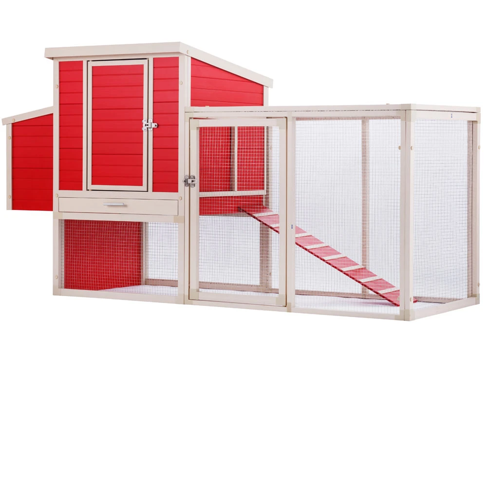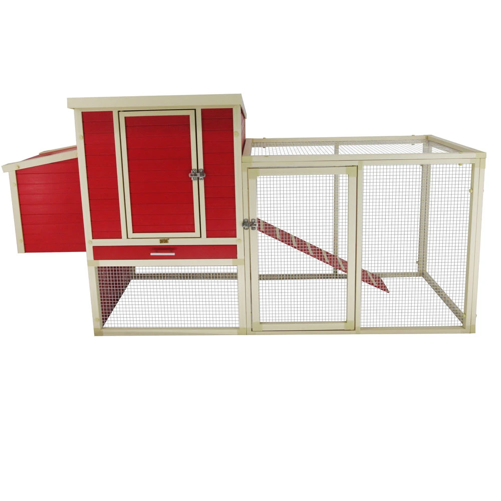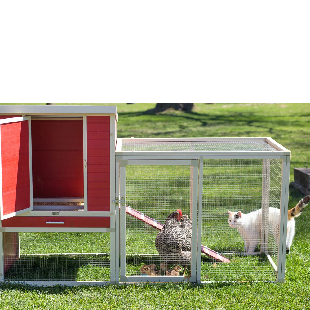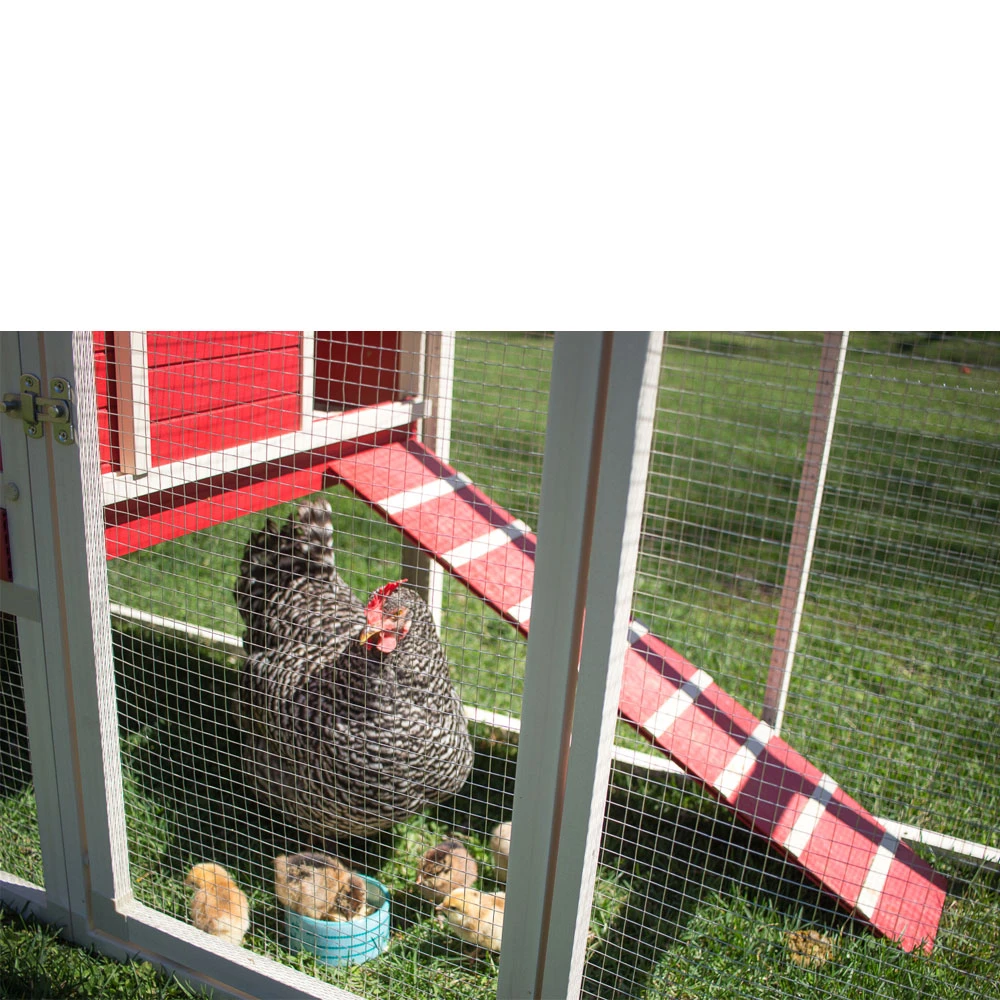 New Age Pet Sonoma Chicken Coop with Pen is made with ECOFLEX material that’s non-toxic, eco-friendly and impervious to moisture and odor. The durable chicken coop features 2 levels of living space, a nesting box with hinged lid for easy egg collecting, 2 roosting bars and an easy to clean, galvanized pull-out tray. The top level has 2 doors, one opens to the main coop while the other allows access to the ramp to the ground level chicken coop, which is open to the ground so your flock has access to a shaded and grassy area.
