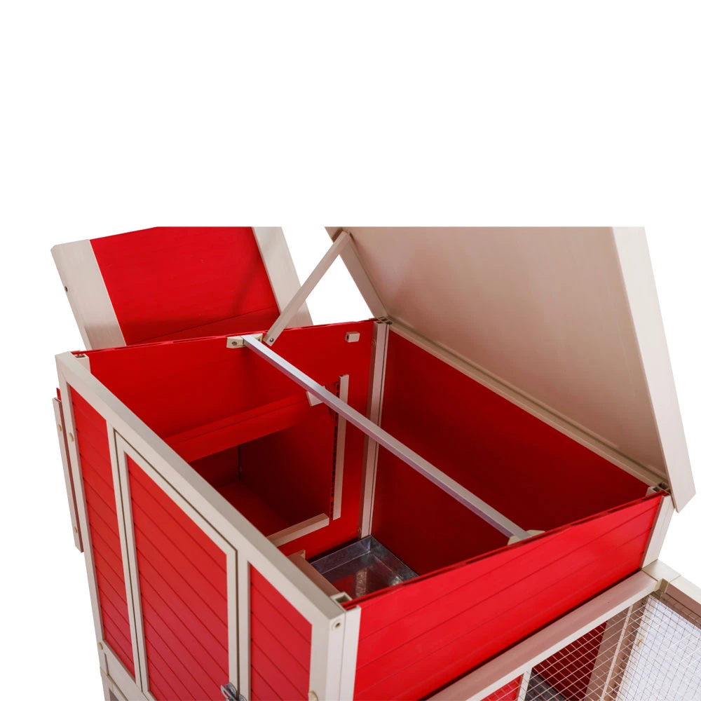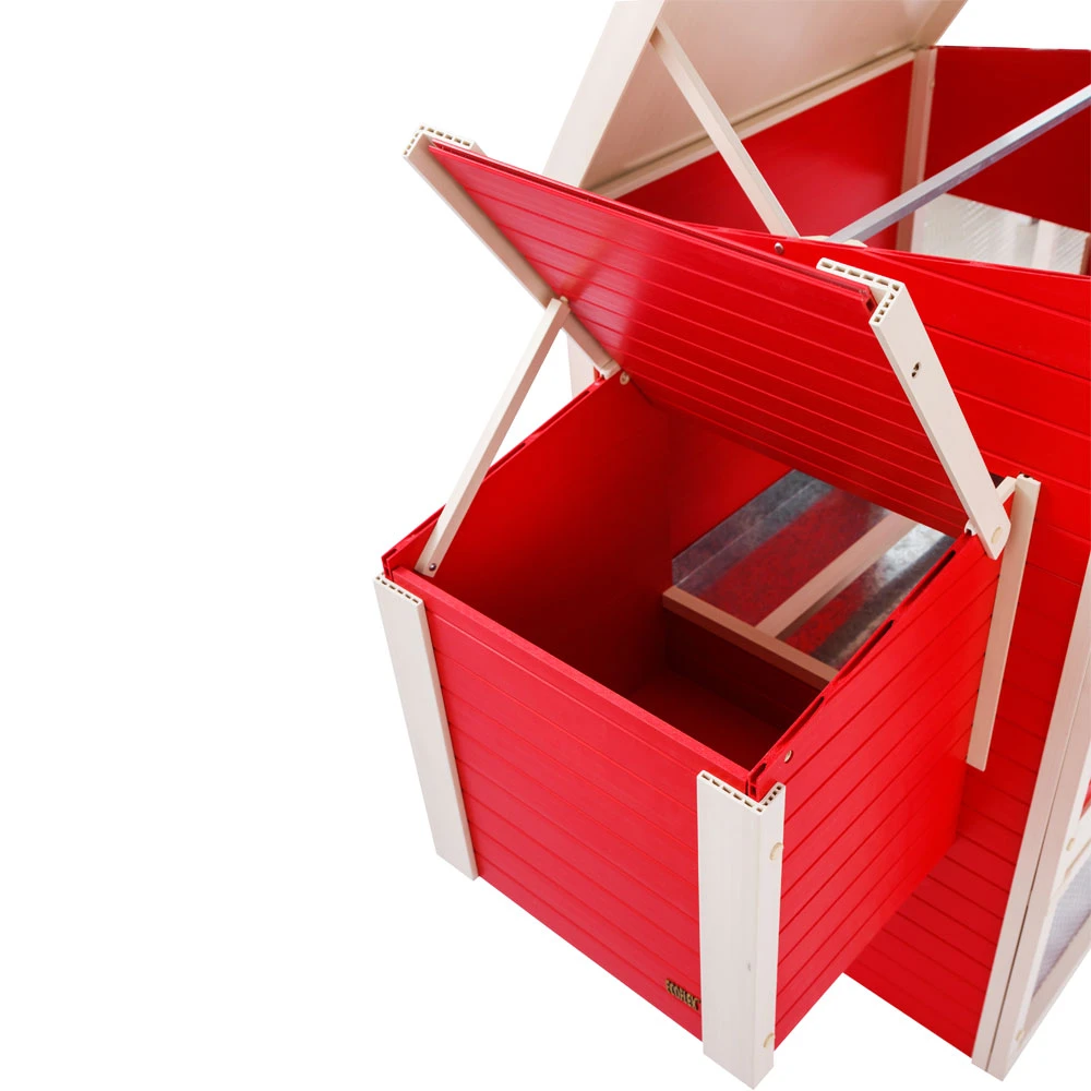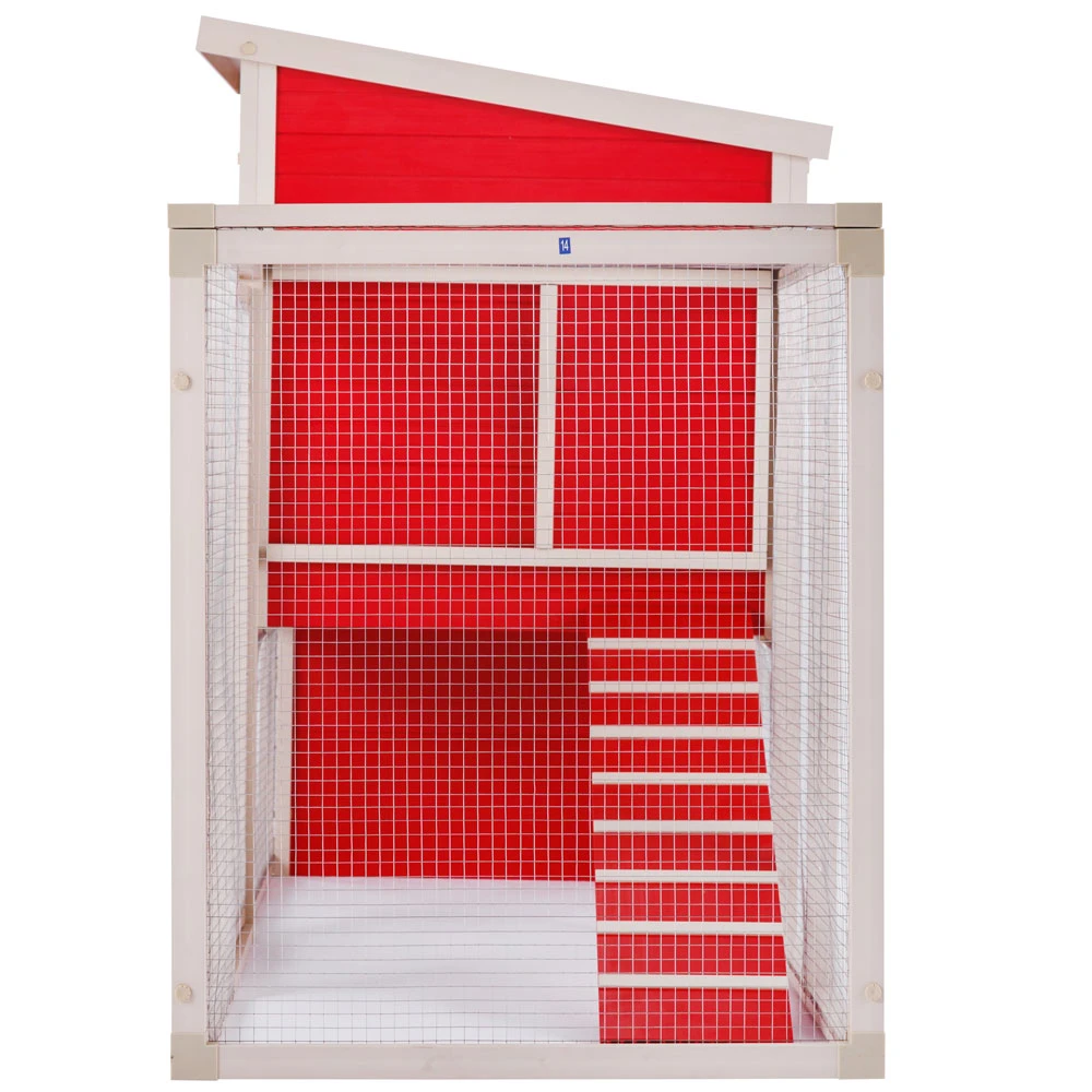 - Top level has 2 doors; one opens to the main coop while the other allows access to the ramp and ground level pen