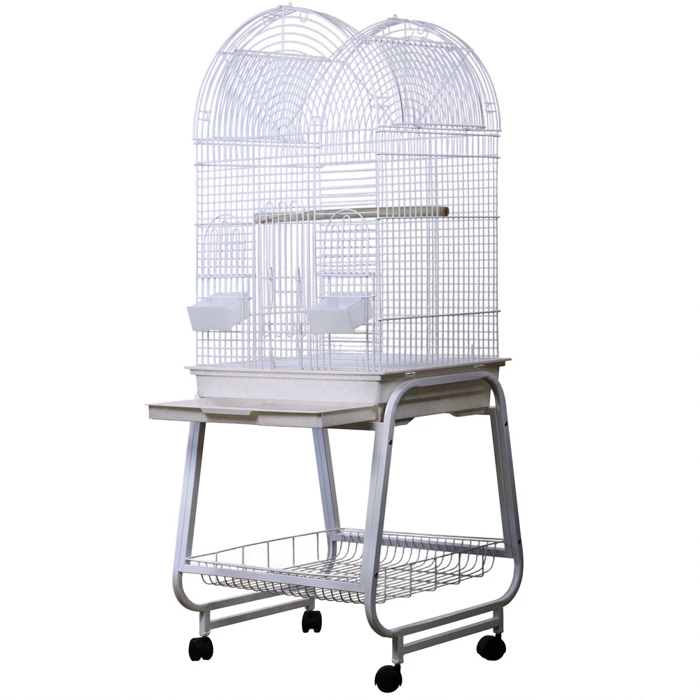 The Seneca Dometop Bird Cage lets you have more fun with your birds because it makes maintaining their cage much easier. A storage tray allows you to keep your bird supplies close by and organized. A removable tray with powder-coated finish takes the work out of cleaning the cage. Customize with your choice of colors. A durable construction will keep your medium-sized birds happy in the Seneca Dometop Bird Cage. This cage comes with two plastic feeder stations and one wood perch.