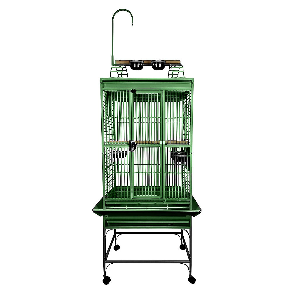 A&E Cage Company PlayTop Cage has two ladders perch and a hook for a toy. As a large front door for easy access. This cage has horizontal side bars, vertical bars front & back and front door safety latch. It has three swing out feeder doors with slide out grill & tray for easy cleaning. it also has a slide out tray under the play top. Removable seed catcher.Come with three stainless steal feeder cups and perch.