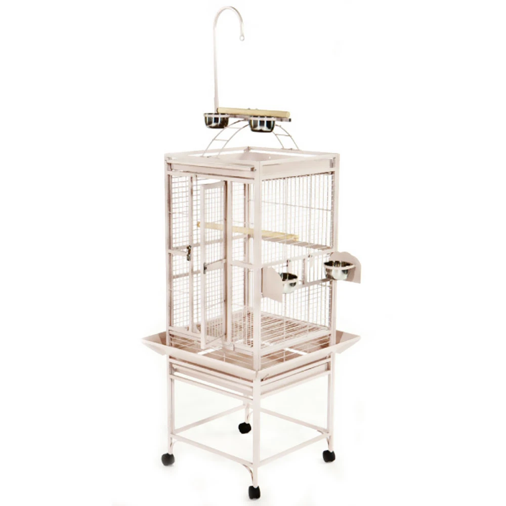 A&E Cage Company PlayTop Cage has two ladders perch and a hook for a toy. As a large front door for easy access. This cage has horizontal side bars, vertical bars front & back and front door safety latch. It has three swing out feeder doors with slide out grill & tray for easy cleaning. it also has a slide out tray under the play top. Removable seed catcher.Come with three stainless steal feeder cups and perch.