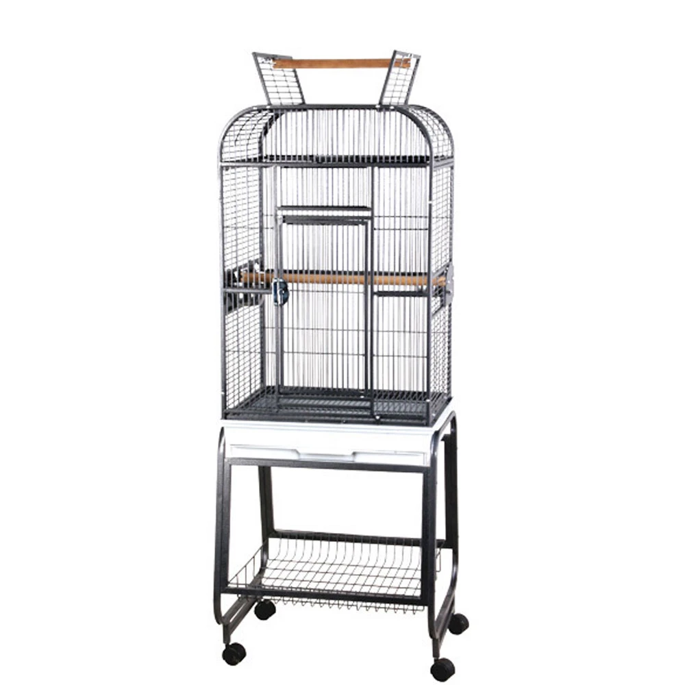 A&E Cage Company Open FlatTop with Plastic Base is the perfect home for your feathered friend with a durable, non-toxic powder-coated finish and front door safety latch. Complete with a open cage top for play time and extra feeder accessories, you and your pet will be entertained for hours. Bird proof front door, feeder door locksBird cage top opens into play topHorizontal side bars, vertical bars front, backFront door safety latchThree (3) swing out feeder doorsThree (3) stainless steel feeder cups & 2 perchesLarge front door for easy accessSlide-out grill & tray for easy cleaningBottom shelf for storageDetached stand with 4 easy rolling castersNon-toxic, durable and safe powder coated finish.