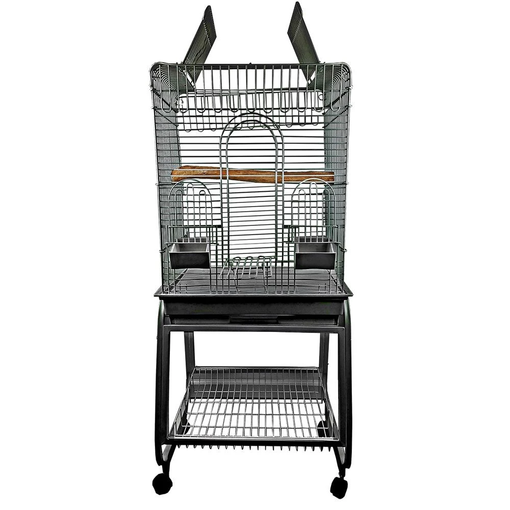A&E Cage Company Open FlatTop with Plastic Base multi-functioning cage can be used with stand or without. Makes for a great tabletop cage without the stand, and can be easily moved on the stand with the rolling casters. Your bird can also perch on the top playpen or on the front door that folds down.
