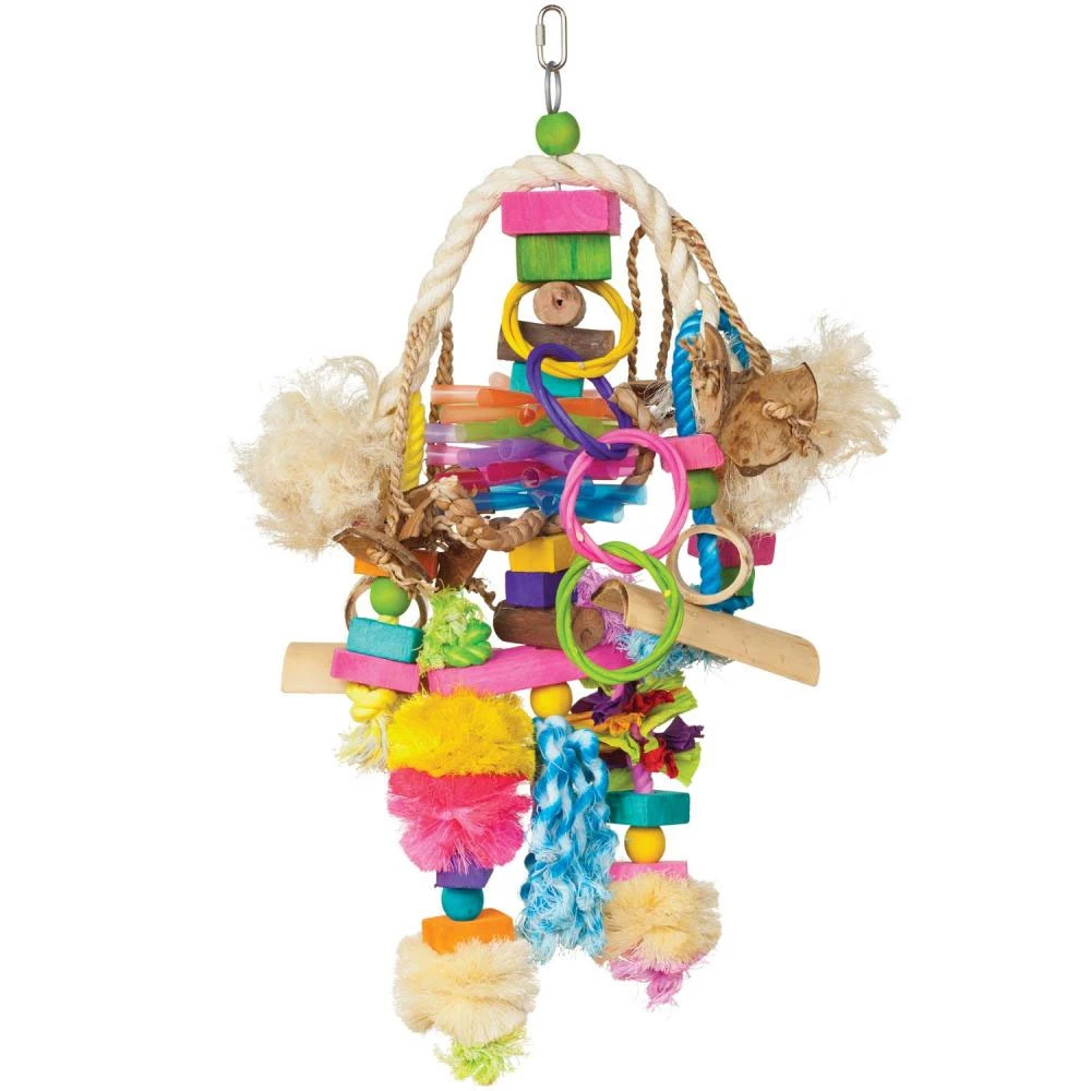 Prevue Bodacious Bites Explosion Bird Toy will provide hours of foot and beak exercise as birds climb, swing and gnaw on a variety of shapes and textures. Made from solid hardwood strung together with cotton rope or leather strips, Bodacious Bites bird toys may also include leather shapes, plastic beads, sea shells and frayed ropes. All materials are 100% safe, non-toxic FD&C colors and connect easily to cage with quick-link attachments. Toy is hand made and actual measurements may vary slightly. As always, supervise birds at play. Our Explosion bird toy is approximately 11″ long, 5 1/2″ wide and 23″ High, ideal for large birds.