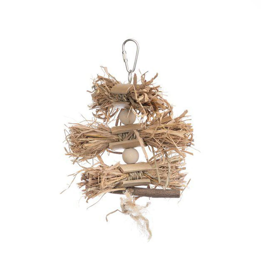 Prevue Naturals Woodland Harvest for Small Animals satisfies natural nest-building urges while providing great beak exercise. Toy is made from natural products including bamboo,straw, and seagrass to satisfy plucking, preening, nesting, and foraging instincts. Woodland Harvest Bird Toy includes additional materials, such as rope and hardwood shapes encouraging beak and tongue exercise. Toy connects easily to cage with stainless steel quick-link attachments actual measurements may vary slightly. As always, supervise birds at play. Our Woodland Harvest Bird Toy 62549 bird toy measures 6″ long, 1 ½” wide, and 8″ high. Ideal for x-small, small, and medium birds measuring 4″ to 18″ beak to tail.