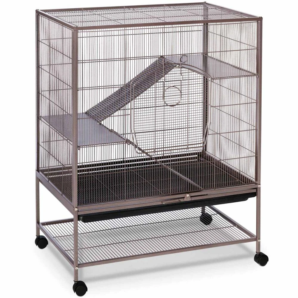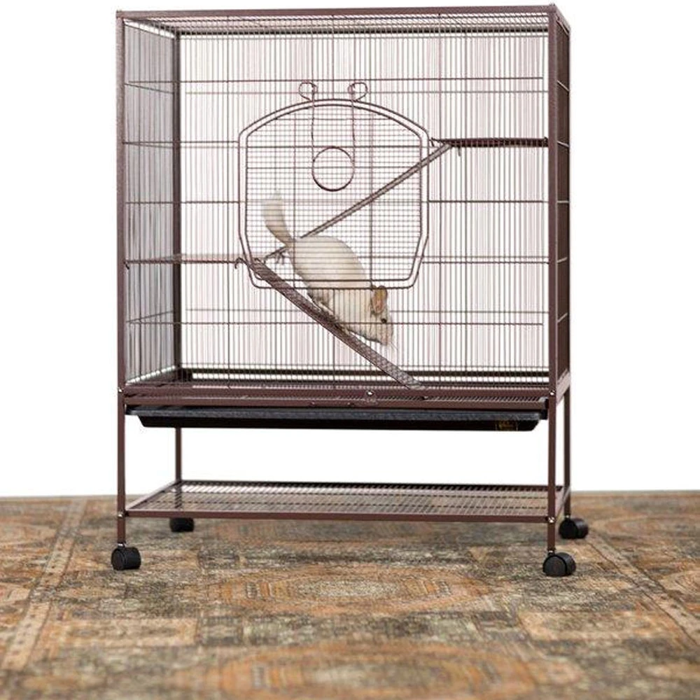 Prevue Rat and Chinchilla Cage is available in an earthtone dusted rose hammertone finish. The ⅜” tight wire spacing and solid metal ramps and platforms make this an ideal cage for rats and chinchillas as well as baby ferrets. The large front door allows easy access to your furry friends while a pull-out bottom grille and tray make cleaning quick and easy. The wind-bell lock on the front of the cage holds the grille in place and keeps pets secure. This practical design also includes an integrated stand with storage shelf and easy rolling casters.