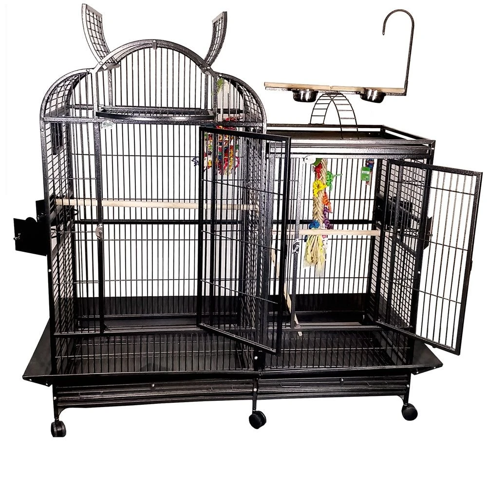 A&E Cage Company Split Level House Cage with Divide offers your bird the benefits of security and sociability that larger birds need to feel part of the family. This spacious cage is packed with options and is ideal for multiple medium sized birds or a single, large bird. This cage is rich in features, including feeder door locks, a bird proof front door with safety latch, a topside play deck with dual ladders and perch, and removable seed catcher. It also features four swing-out feeder doors with four stainless steel feeder cups and an additional breeder door. A slide-out grill and tray offer easy cleaning. Casters make this birdcage mobile and It’s coated entirely in a non-toxic durable powder finish.