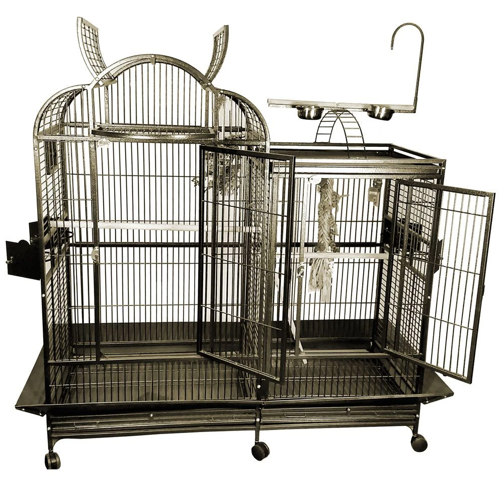A&E Cage Company Split Level House Cage with Divide offers your bird the benefits of security and sociability that larger birds need to feel part of the family. This spacious cage is packed with options and is ideal for multiple medium sized birds or a single, large bird. This cage is rich in features, including feeder door locks, a bird proof front door with safety latch, a topside play deck with dual ladders and perch, and removable seed catcher. It also features four swing-out feeder doors with four stainless steel feeder cups and an additional breeder door. A slide-out grill and tray offer easy cleaning. Casters make this birdcage mobile and It’s coated entirely in a non-toxic durable powder finish.